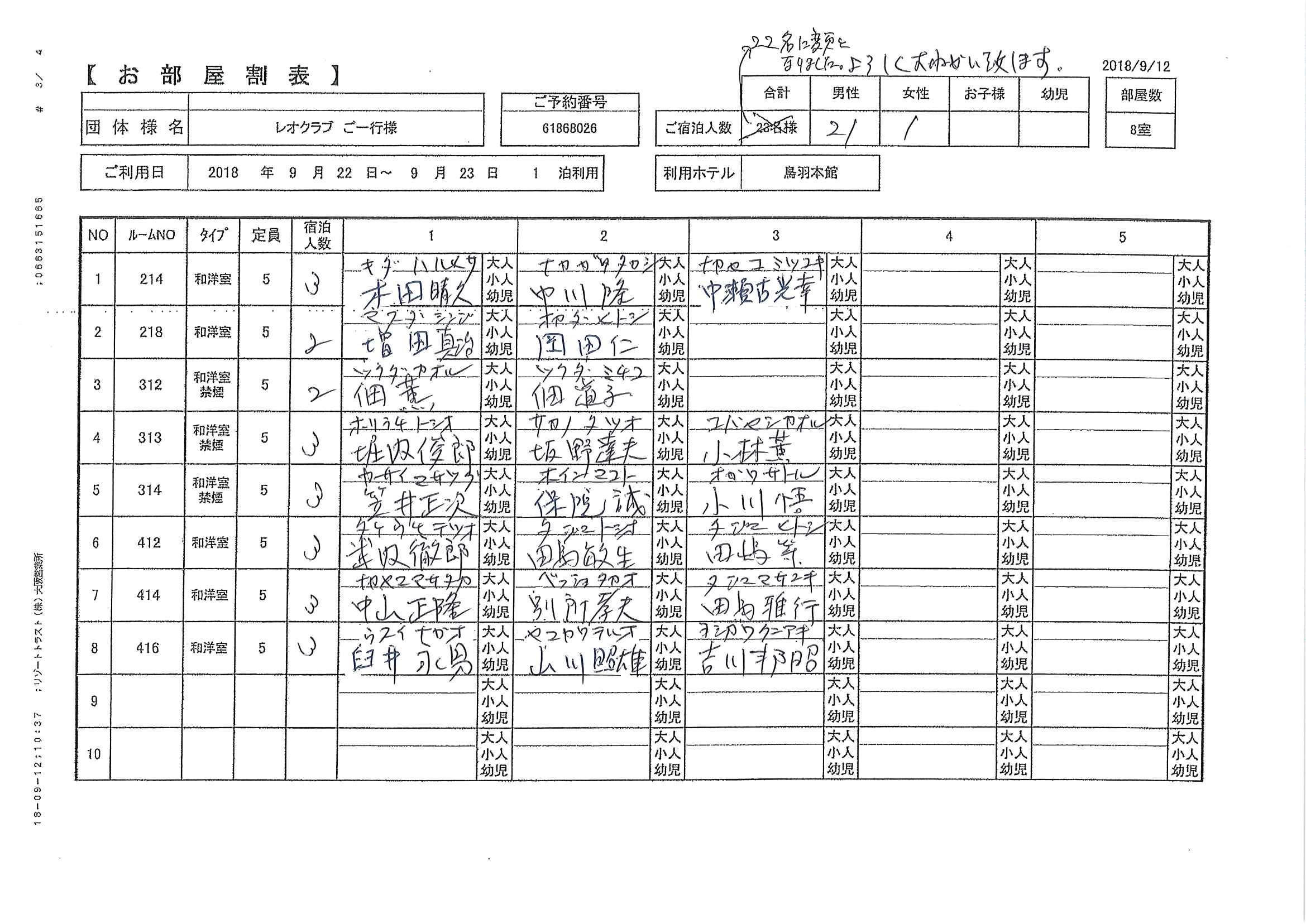 2018年9月22日 Exiv鳥羽宿泊者 ⇒